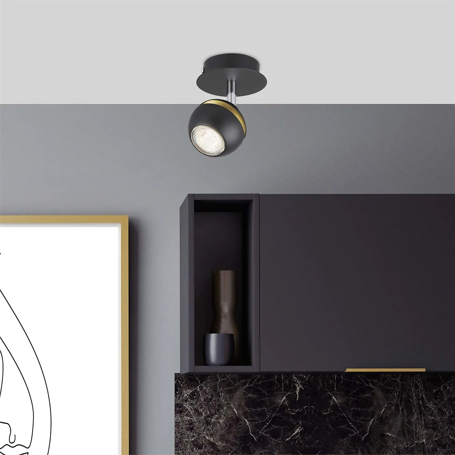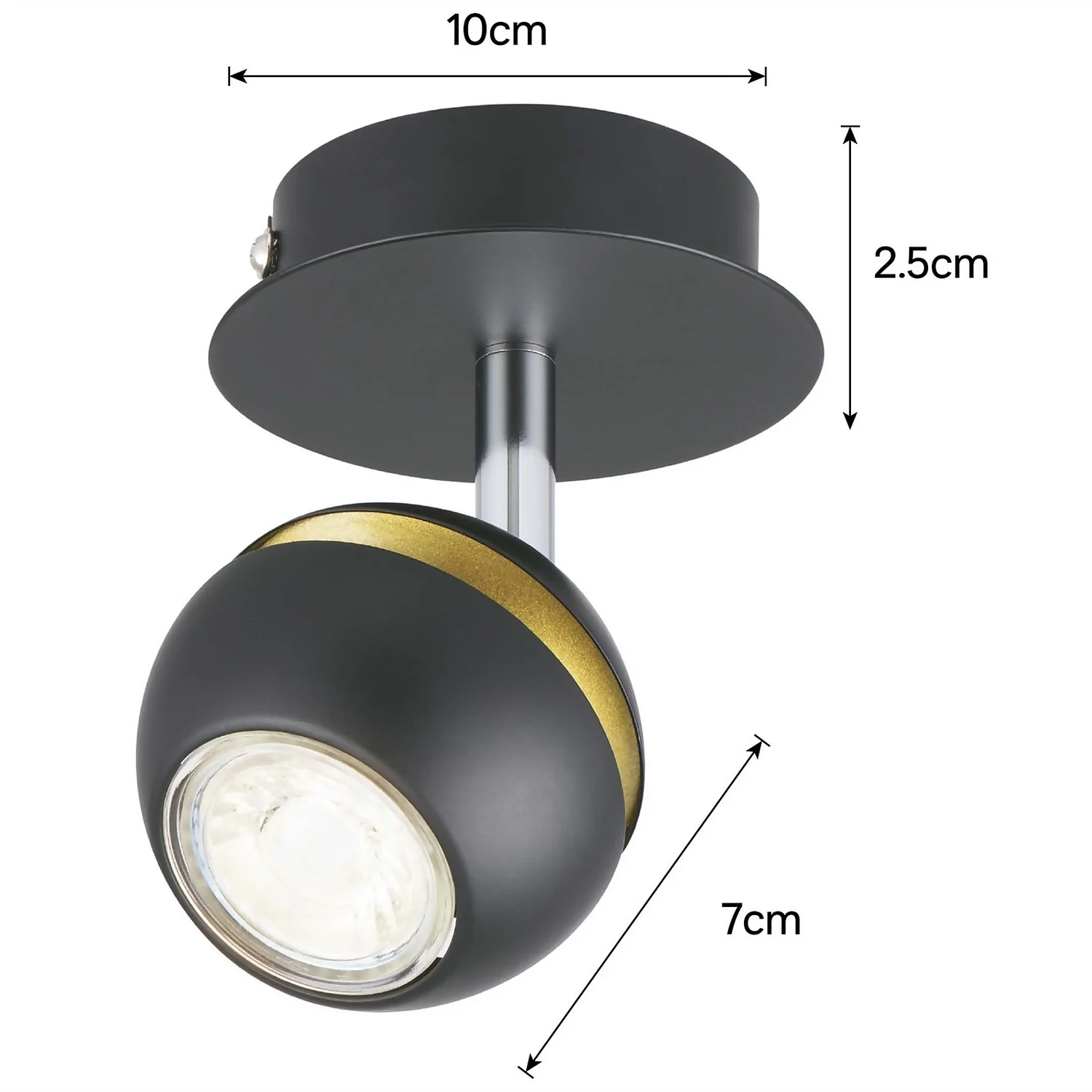 Austin single lamp spotlight has all the right curves. The matt black, ball shaped adjustable lamp with gold detailing makes a bold statement light for either wall or ceiling.