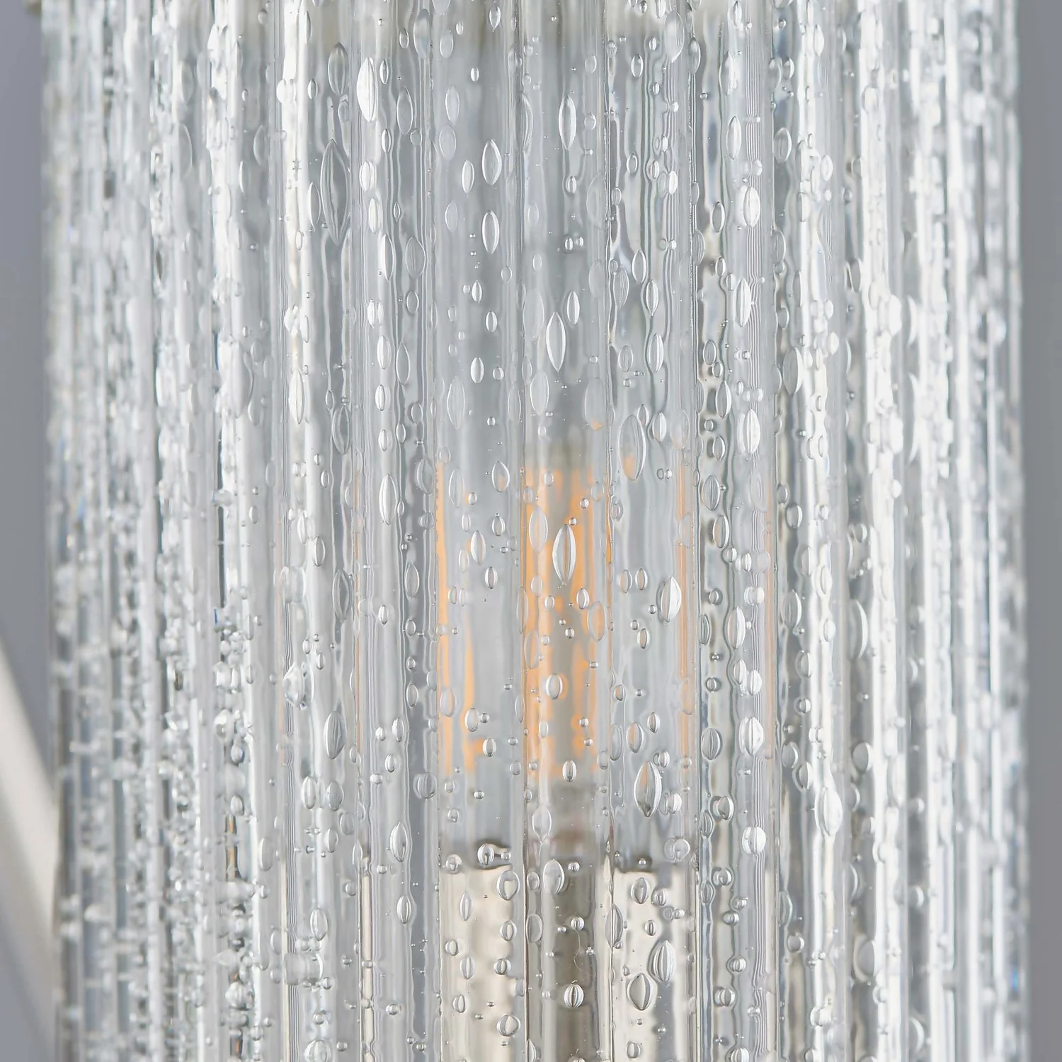 A unique classic styled chandelier in bright nickel plated finish. Inspired by hurricane lamps, the clear ribbed glass shades with bubble details create a perfect diffused light when lit by filament LED lamps . Each shade rests subtly on the rectangular section hoop and is suspended by three fixed arms.